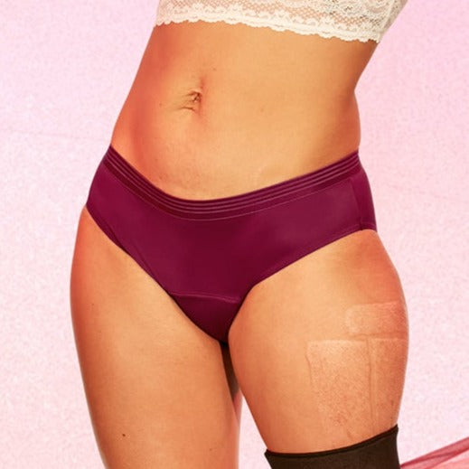 Le design de la culotte menstruelle Bikini possède une taille élastique, tandis que la culotte menstruelle Hipster possède une bordure en dentelle.